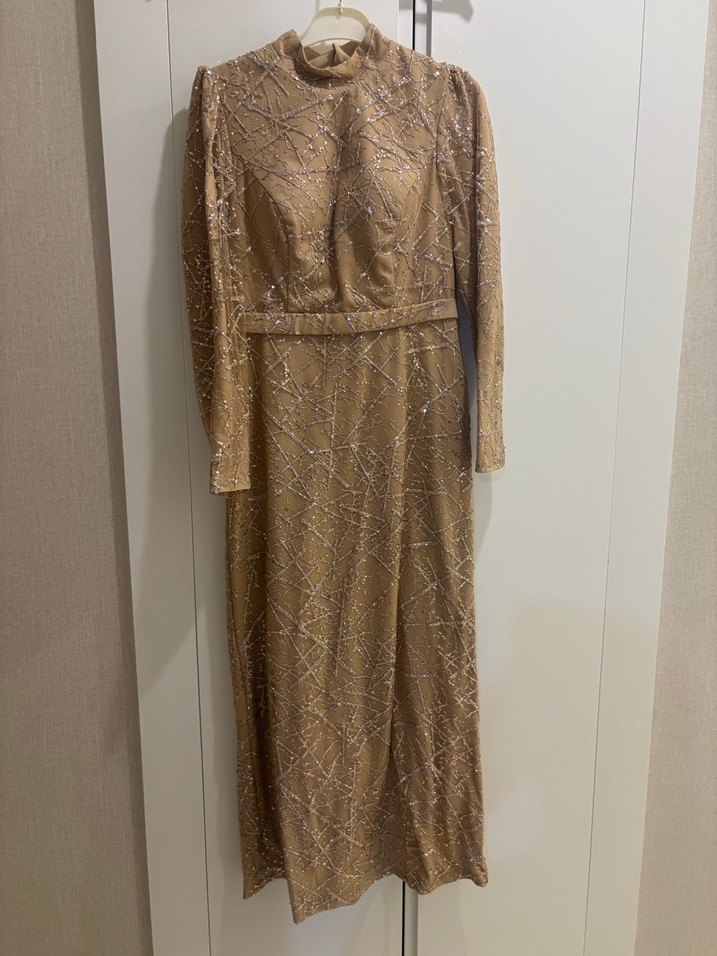 Bej Parlak kalem Uzun Tesettür Abiye Elbise