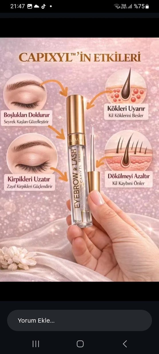 Parlak bej kaş ve kirpik serumu, boşlukları doldurur, kirpikleri uzatır, zayıf kirpikleri güçlendirir, kökleri besler ve dökülmeyi azaltır.