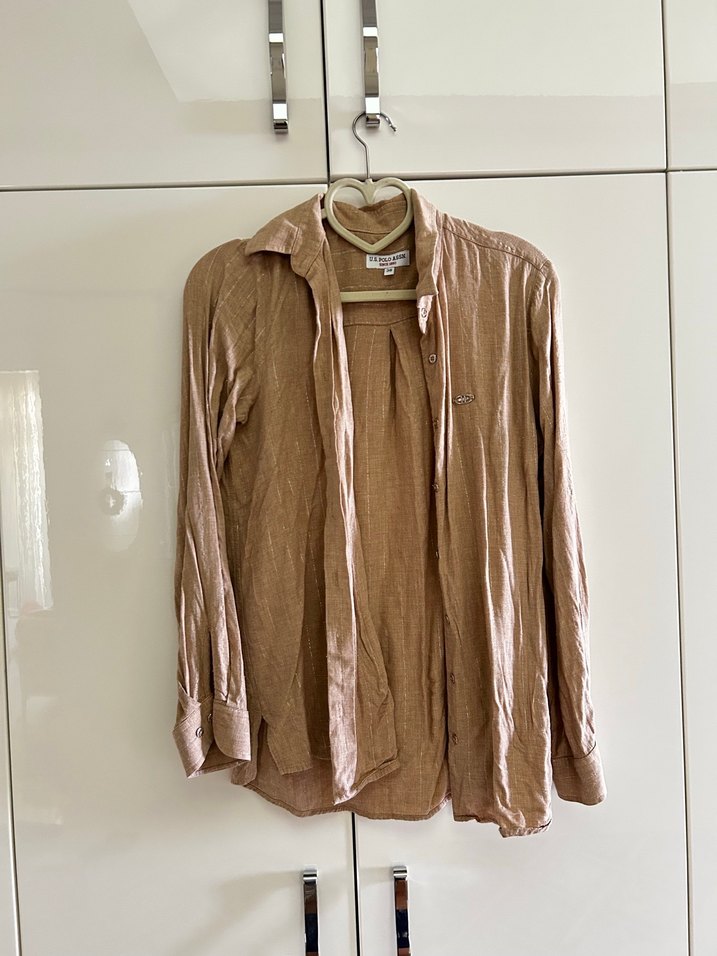 Bej renkli keten kumaştan, uzun kollu, yakalı ve düğmeli, bol kesim kadın gömlek. Günlük kullanıma uygun, Paris tarzı şık ve rahat.