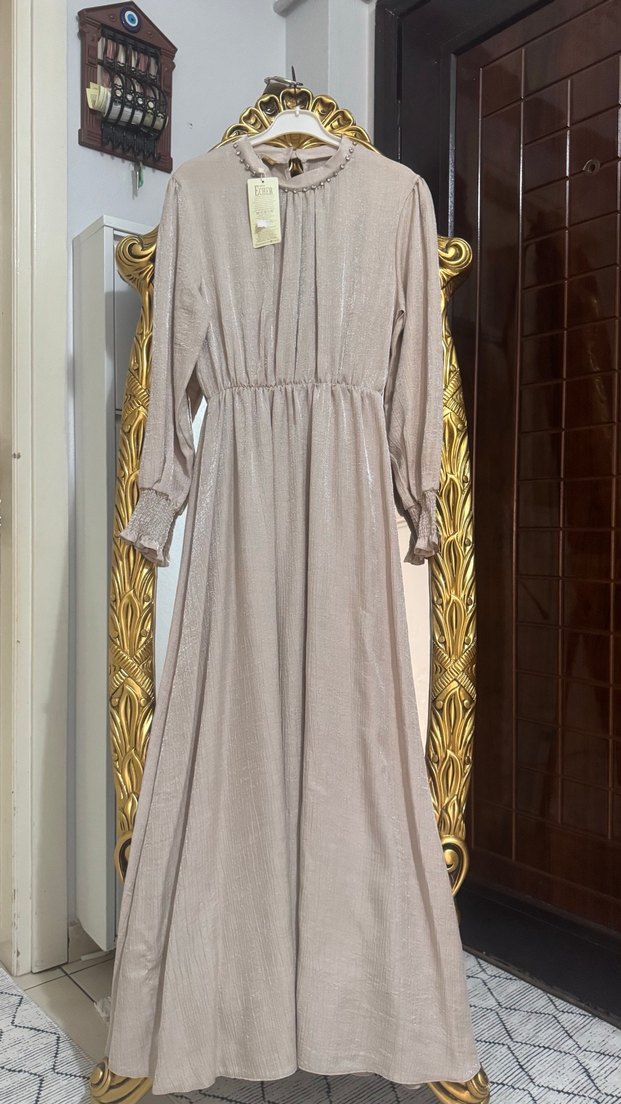 Bej Parlak Keten Uzun Elbise