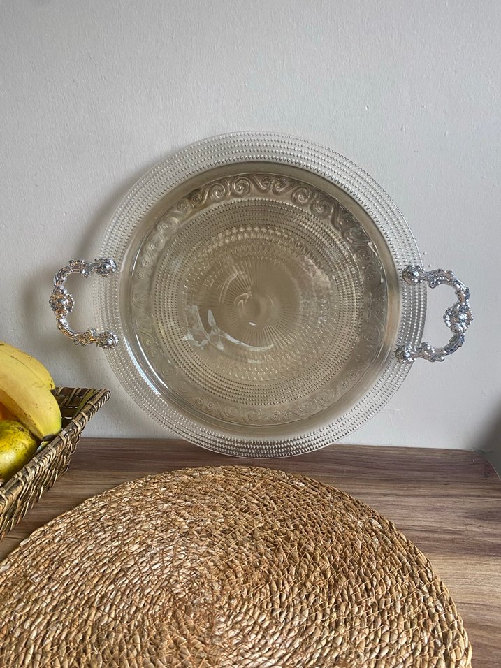 Parlak bej renkte, kulplu ve detaylı klasik tepsi, düz yüzeylidir. ️