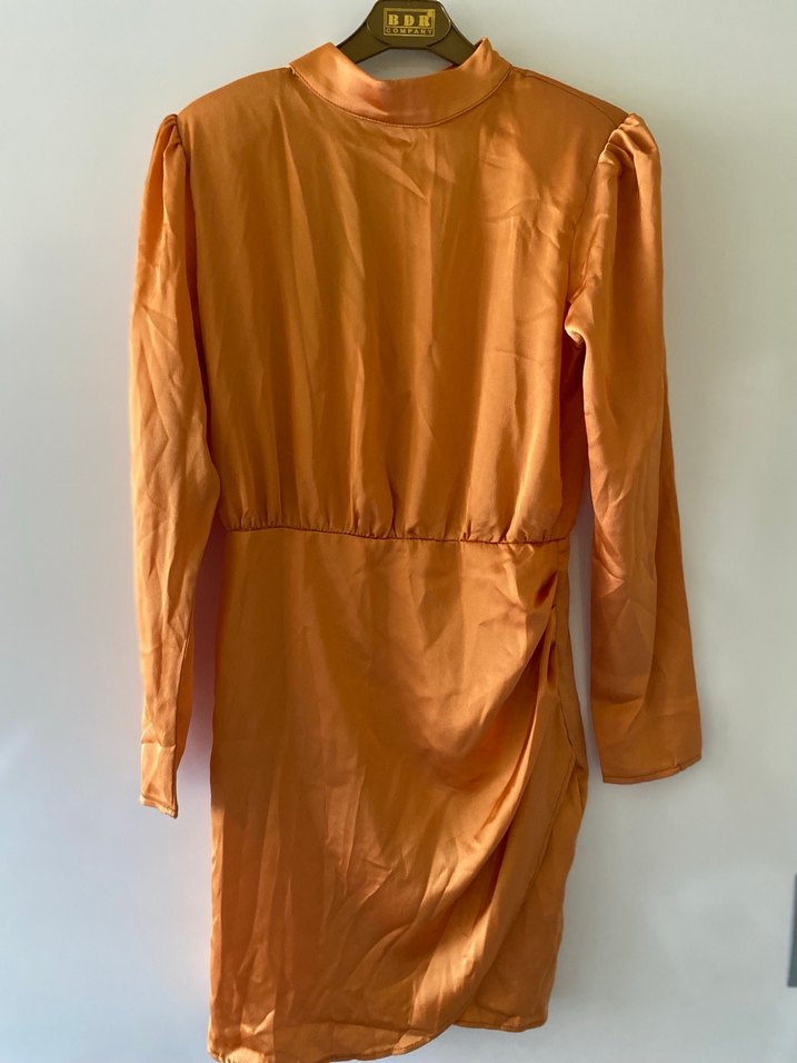 Bej parlak midi boy drapeli, uzun kollu, yüksek yakalı, vücuda oturan elbise. Günlük kullanım için minimalist ve avangart tarzda.