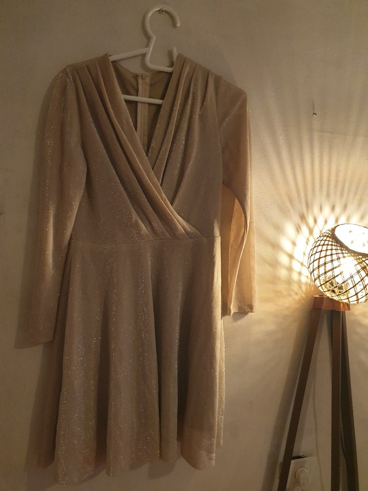 Bej renkli, drapeli V yaka ve uzun kollu midi abiye elbise. Rahat kesimi ve parlak dokusu ile düğünler için uygundur. ✨