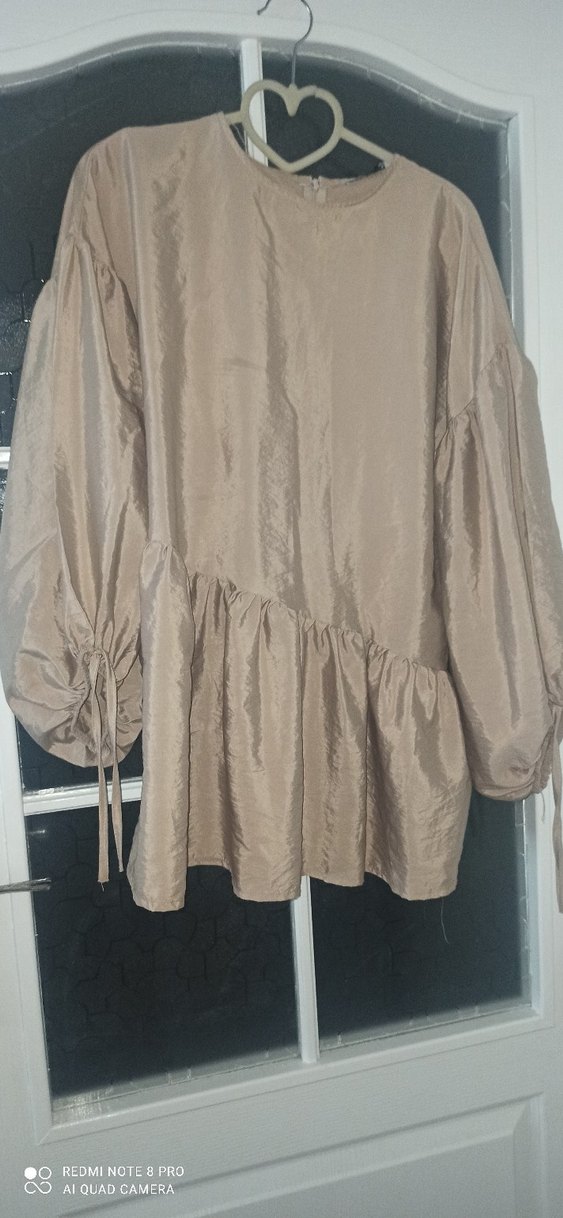Yumuşak saten kumaştan, uzun kollu, drapeli ve parlak bej renkli midi tunik. Salaş kesimi ve bisiklet yaka ile sokak modasına uygun.