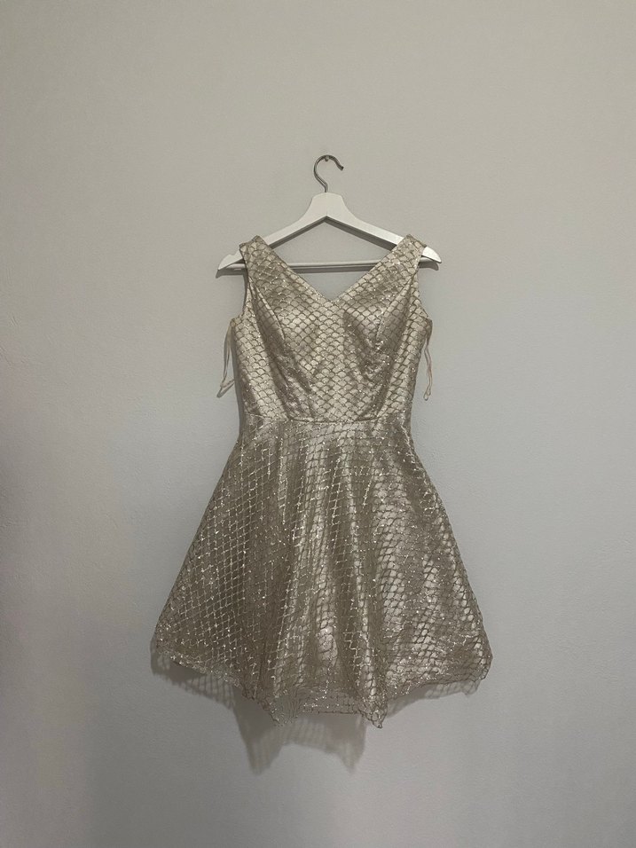 Bu dar kesim bej mini abiye elbise parlak bir yüzeye sahip, V yakalı ve drapeli detaylarla süslenmiştir. İnce askılı ve çağdaş tarzda, partiler için uygundur. ✨