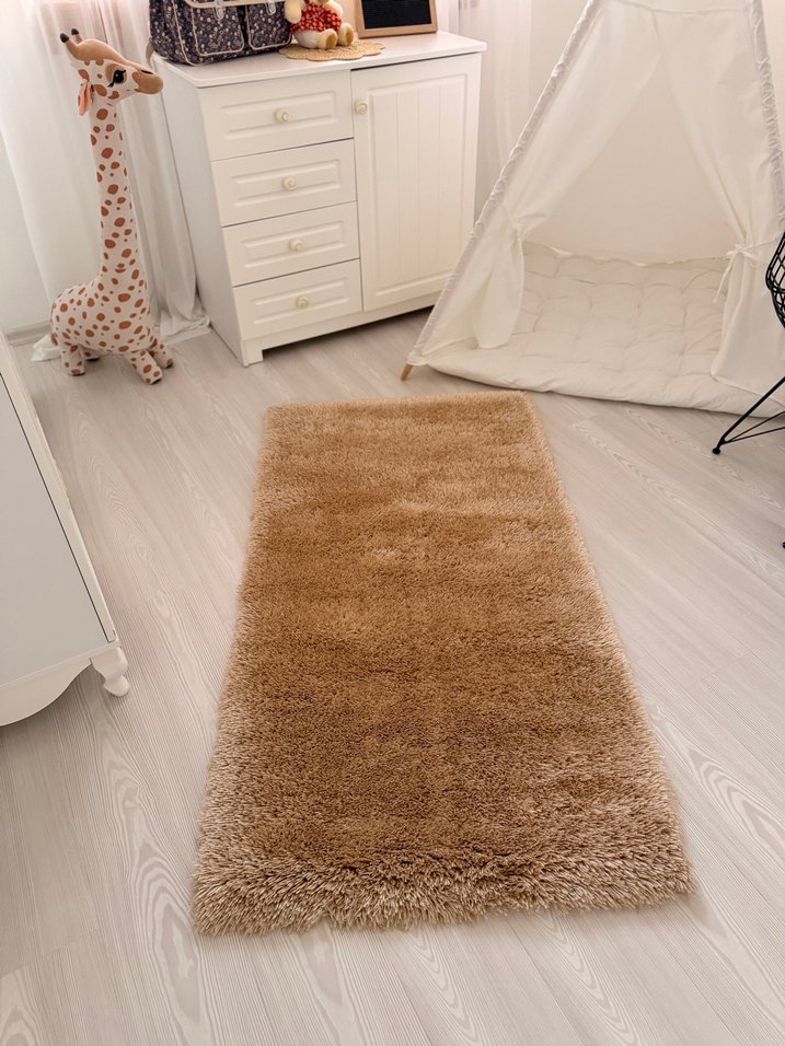Bej renkli, parlak ve modern tarzda, yumuşak dokulu ve desensiz halı, mekana sıcaklık katar.