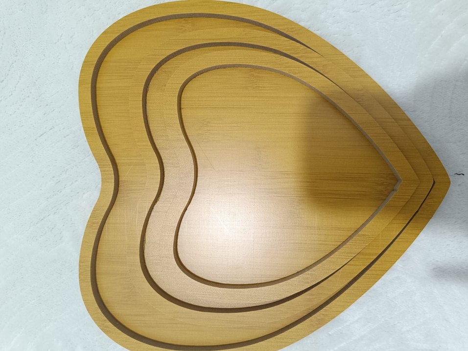 Parlak yüzeyli, ahsap renkli, kalp şekilli modern seti. Desensiz ve şık tasarımıyla sofralarınıza zarafet katar. ️