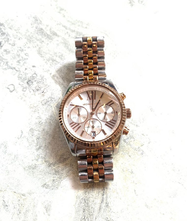 Bej parlak kadrana sahip, modern klasik tasarımlı kadın saati. Gümüş ve altın tonlarında tokalı çift renkli metal kayış bulunur. Kronograf alt kadranlar ve tarih göstergesi içerir. ⌚