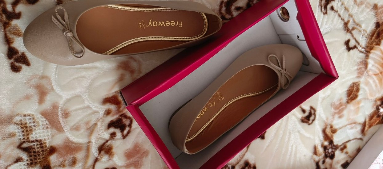 Bej parlak renkte, dolgu topuklu, nakışlı ve tokalı minimalist klasik tasarım kadın babet. kutulu ürün