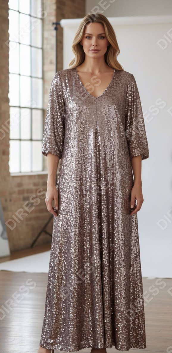 Payetlerden leopar desenli, V yaka ve uzun kollu, bol kesim uzun abiye elbise. Parlak payetlerle kaplı ve hafif leopar deseniyle parti için uygundur. ✨ 54 bedene kadar uygundur