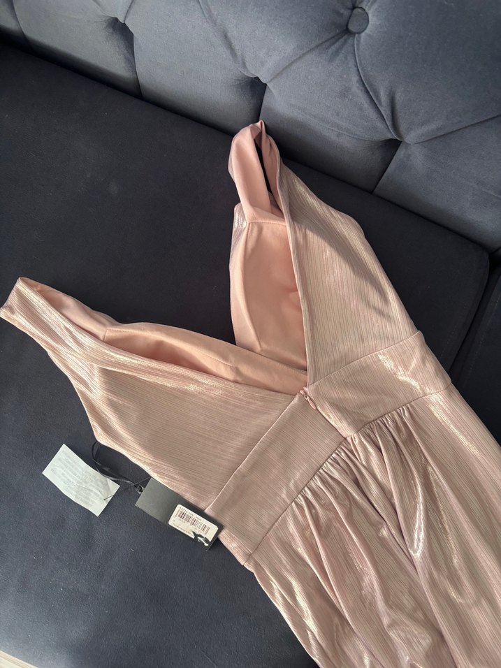 Bej parlak renkli, pilili ve vücuda oturan uzun abiye elbise. V yaka ve ince askılı, gösterişli düğünler için uygun. ✨