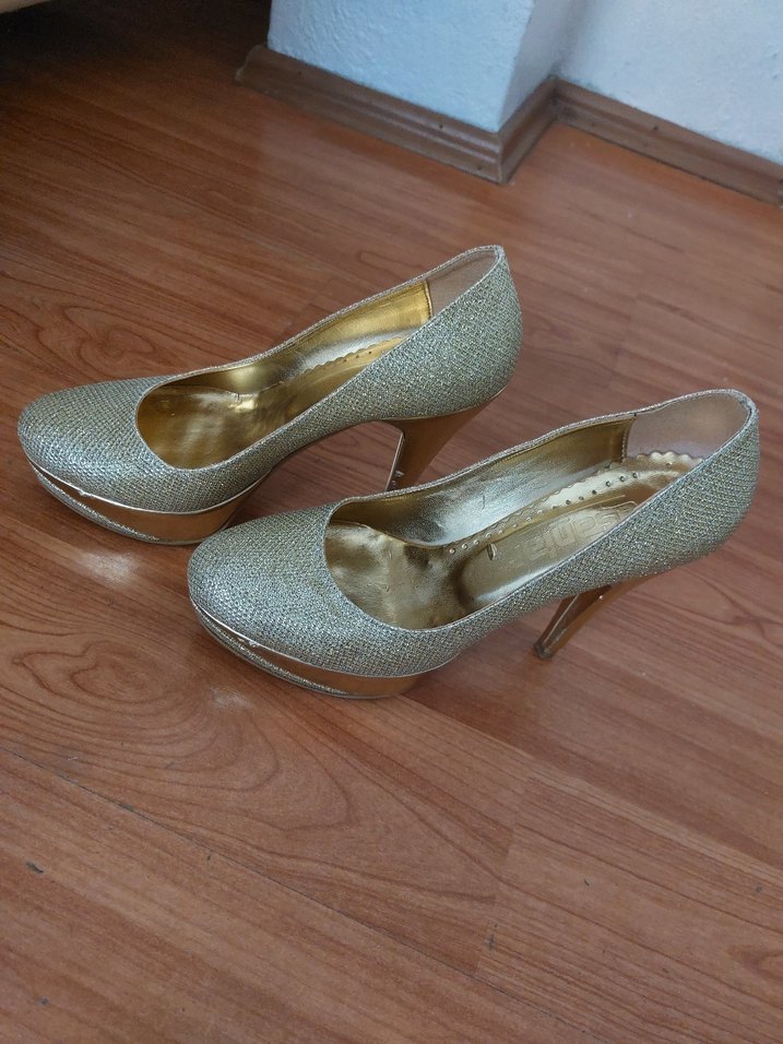 Bej renkte, parlak simli ve hafif yılan desenli platform topuklu ayakkabılar. Kauçuk malzemeden, düğün ve özel davetler için uygundur. ✨