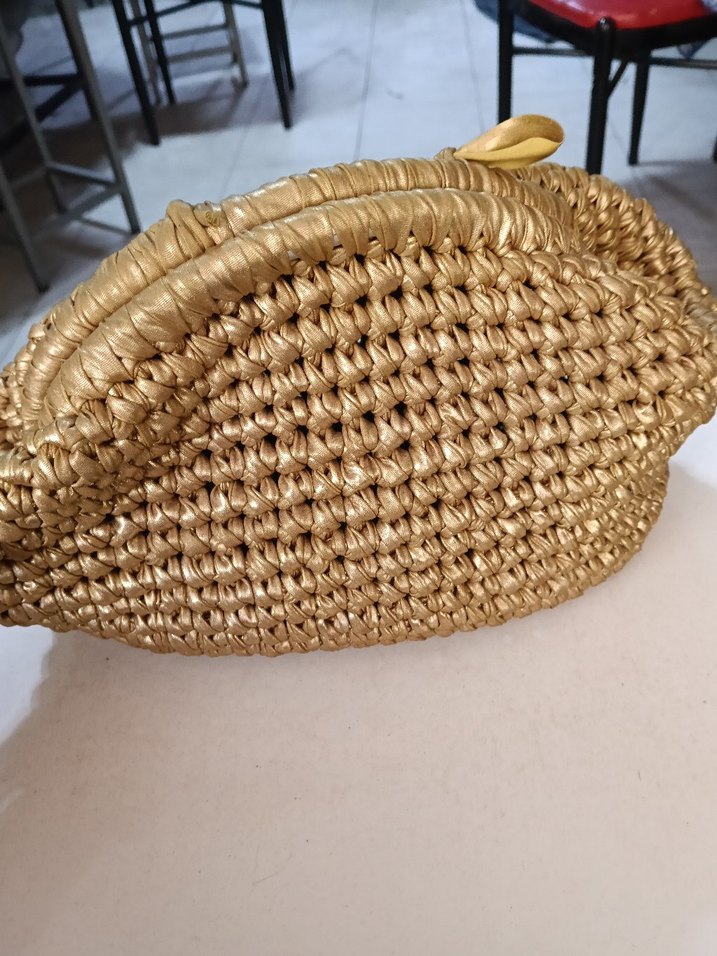 Parlak bej renkte, pliseli detaylara sahip bohem tarzda vintage kadın el çantası. Günlük kullanıma uygundur. ✨
