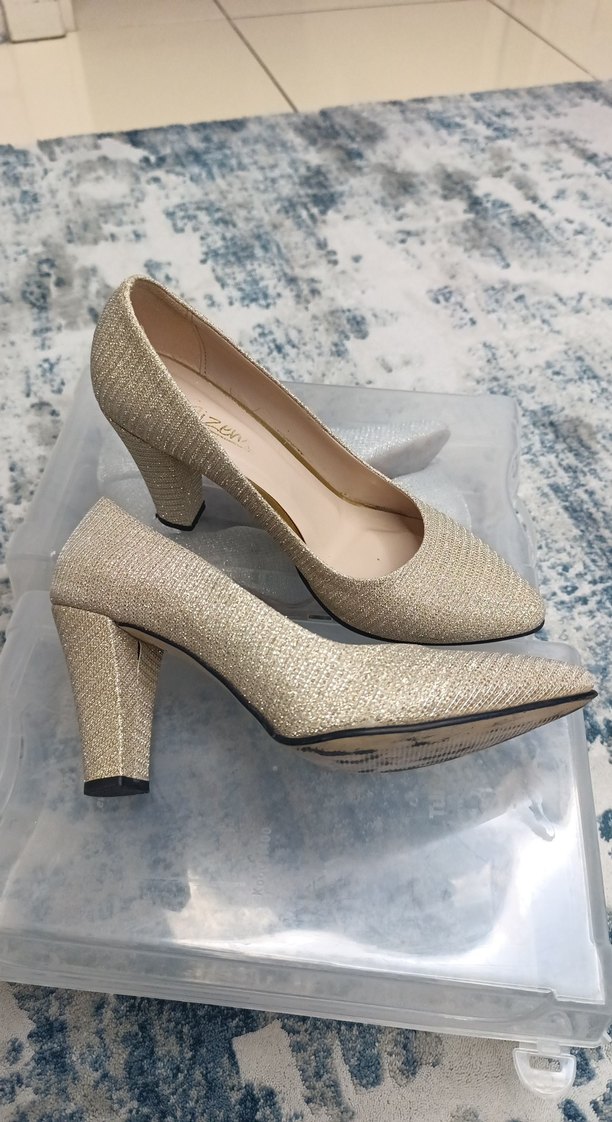 Bej renkte, parlak pliseli tasarıma ve blok topuğa sahip, hafif yılan deseni detaylı kadın gece ayakkabısı.