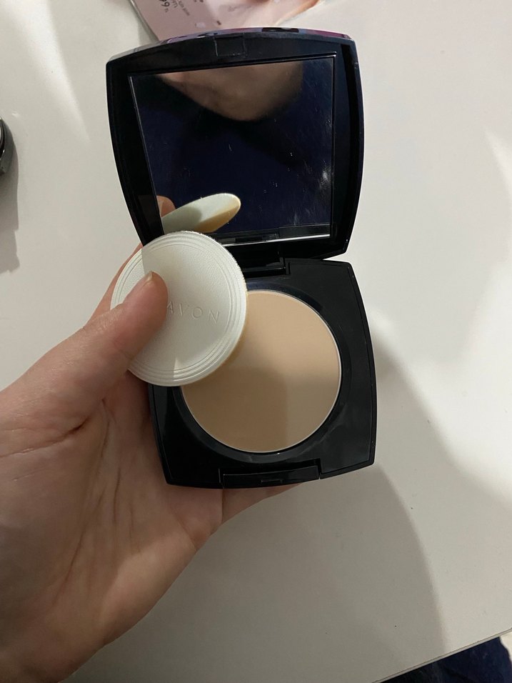 Aynalı kompakt kutuda parlak finisli bej pudra ve uygulama süngeri. ✨