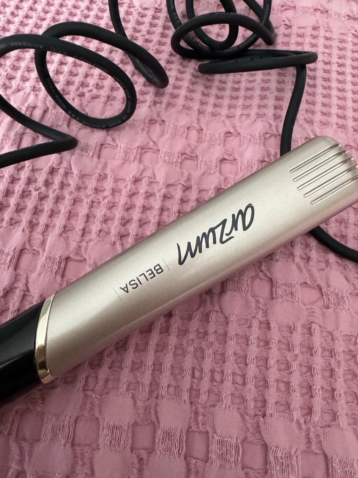 Parlak bej renkli Belisa saç düzleştirici, kullanımı kolay kıvrımlı kabloya sahiptir. Üzerinde "wmzno" yazısı bulunur. ✨