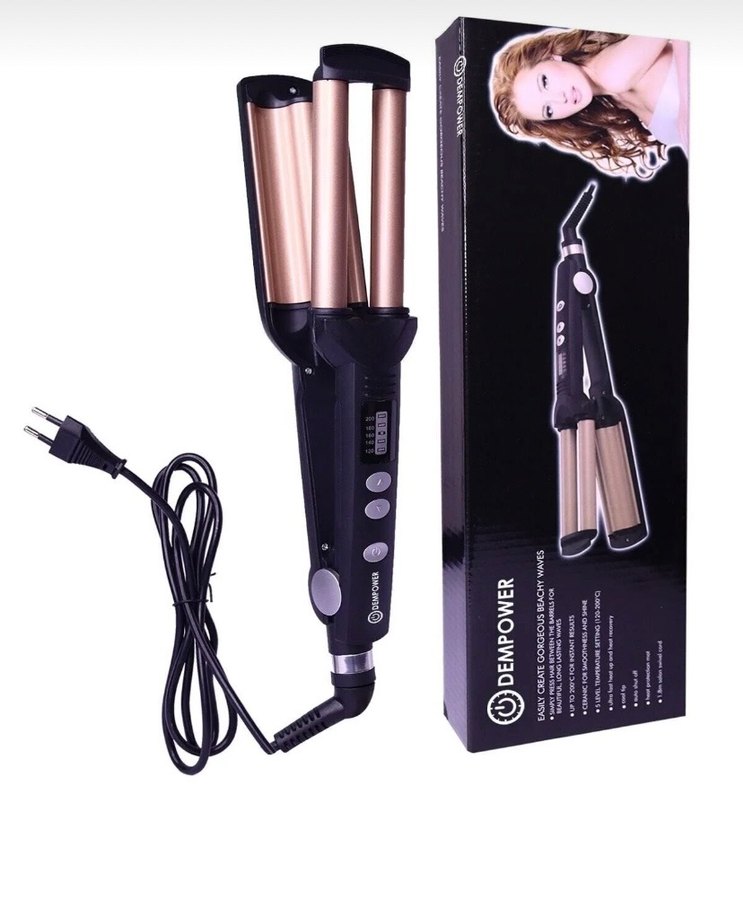 Bej parlak saç şekillendirici, çift varil ve ayarlanabilir sıcaklık kontrolü ile çok yönlü kullanım sağlar. Dijital ekran ve döner kablo mevcuttur.