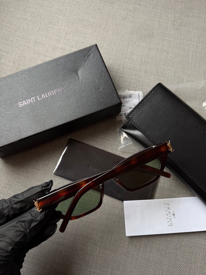 Parlak bej renkte, Saint Laurent markalı, çağdaş Paris tarzında kadın gözlüğü. Moda öncülerine uygun avant-garde tasarım. ️