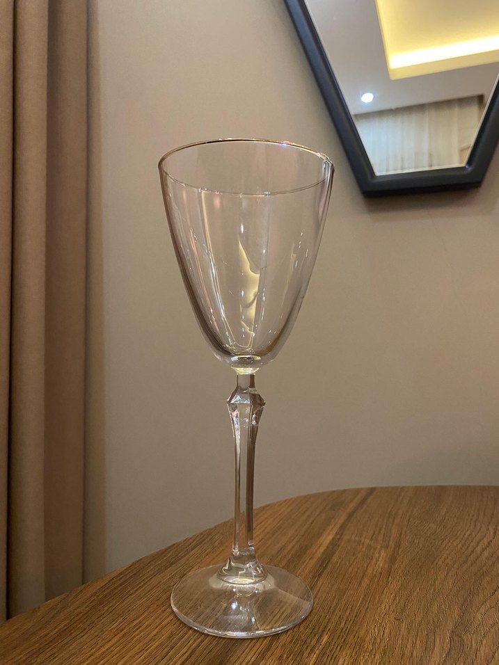 Uzun saplı ve şık şekilli, bej parlak renkte şarap kadehi. Resimlerde görüldüğü gibidir kırık çatlak yok ama üst kısımdaki bazı altın yaldızlı boyalar makinaya atıldığı için bir kaçında silik gibi o kadar Kadeh 23 cm 12 kişilik