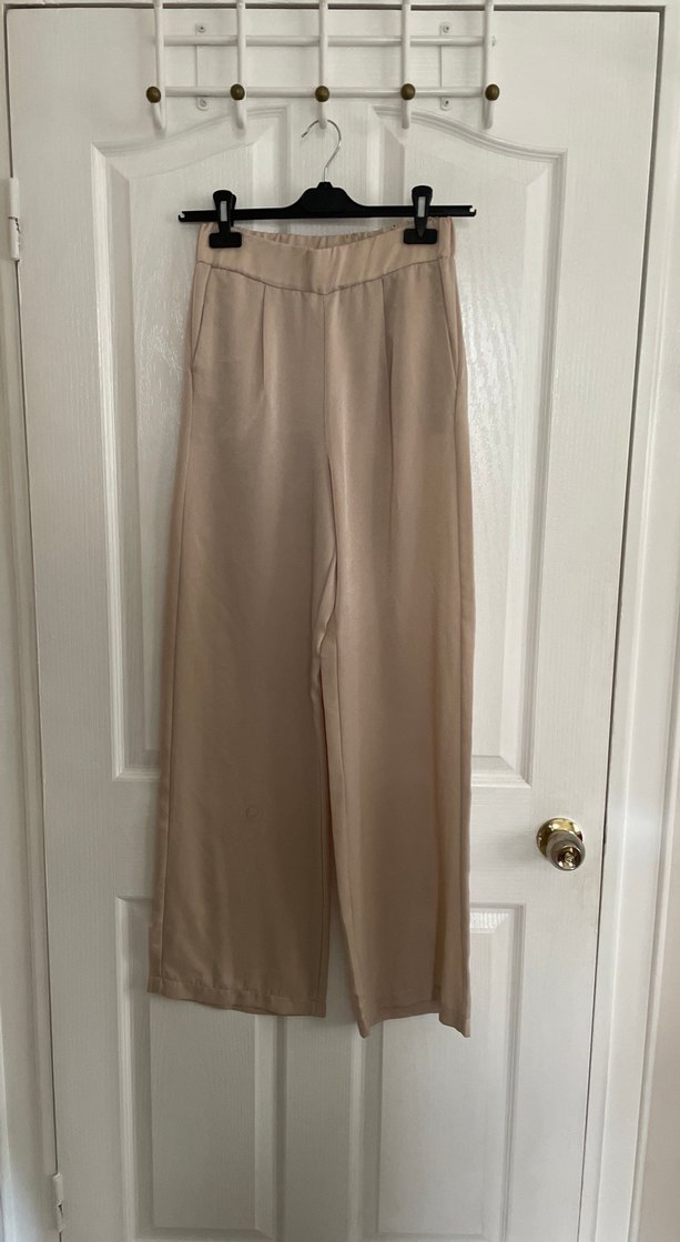 Bej renkte, regular fit kesime sahip, yumuşak ve ipeksi dokulu kumaş pantolon. Cepli. Beli lastikli. Saten. Uygun iç çamaşırı ile giyilmeli yoksa iç belli edebiliyor. Kalıbı biraz dar.