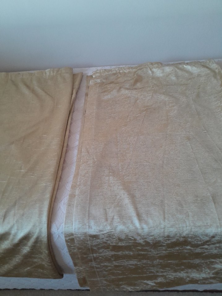 Parlak bej renkte, düz ve desen içermeyen fon perde normal kullanımda olan perde uzunluk 220cm eni 235 iki parçadan oluşuyor toplam 440 cm
