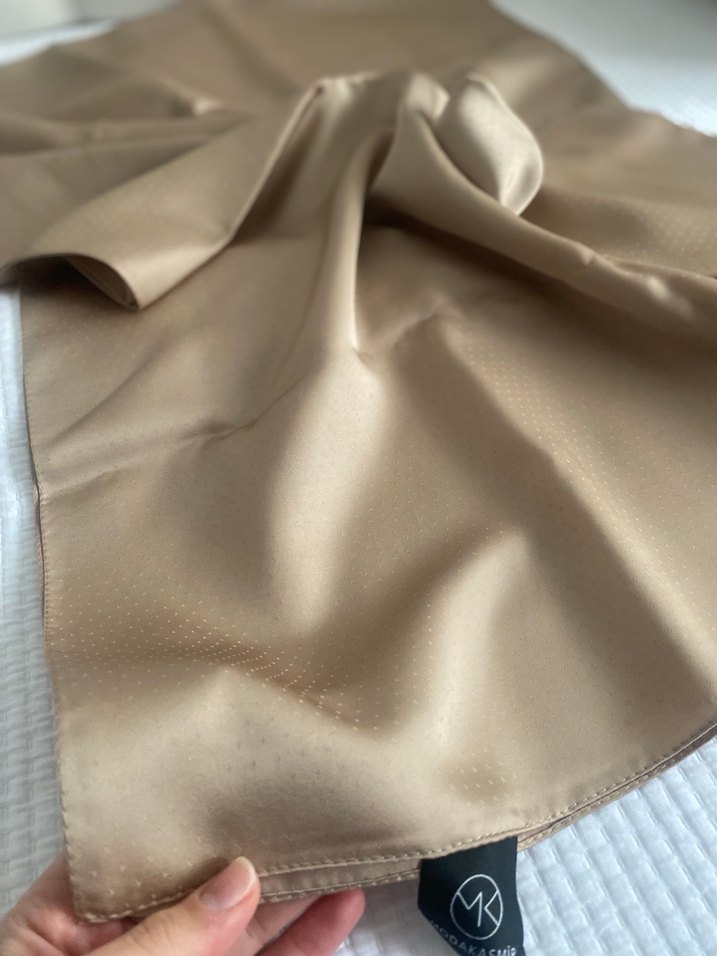 Bej renkli, parlak ve saten dokulu kadın şal, drapeli tasarımıyla minimalist bir görünüm sunar. ✨