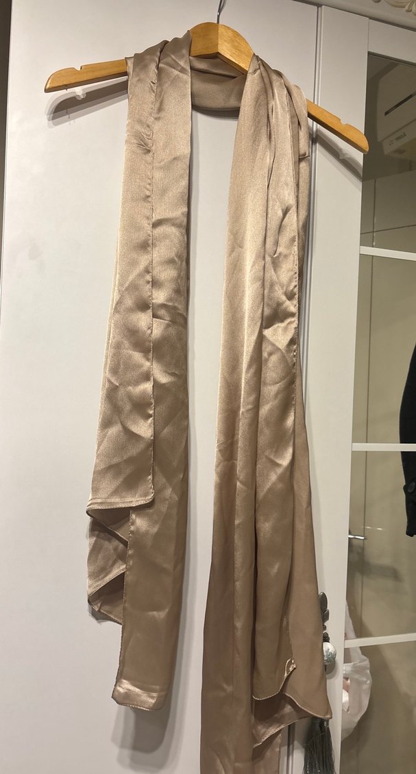 Bej renkli, parlak ve satenimsi dokuda, drapeli kadın şalı. Paris esintili bohem tarzıyla klasik şıklık sunar.