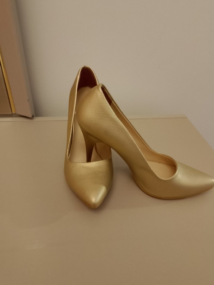 Parlak bej renkte, sivri burunlu ve lastik malzemeden yapılmış stiletto topuklu kadın ayakkabısı. Ofis için modern klasik tarzda.