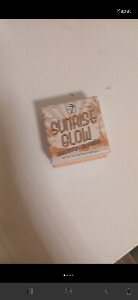 Bej renkli, parlak yüzeyli Sunrise Glow markalı allık. Ambalajında "Glow Sutirise" yazısı bulunur. Pürüzsüz ve parlak bir dokusu vardır.