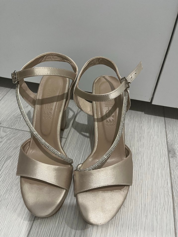 Bej renkli, parlak stiletto topuklu tokalı abiye ayakkabılar. Satenimsi dokuda, minimal ve çağdaş tasarımlı, düğün için uygun klasik şıklıkta.