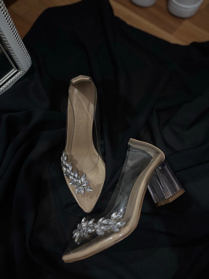 Bej ve gri tonlarında parlak taş detaylı, şeffaf cam topuklu kadın abiye ayakkabısı, düğün ve özel geceler için uygundur. ✨ sadece bir kere giyildi.