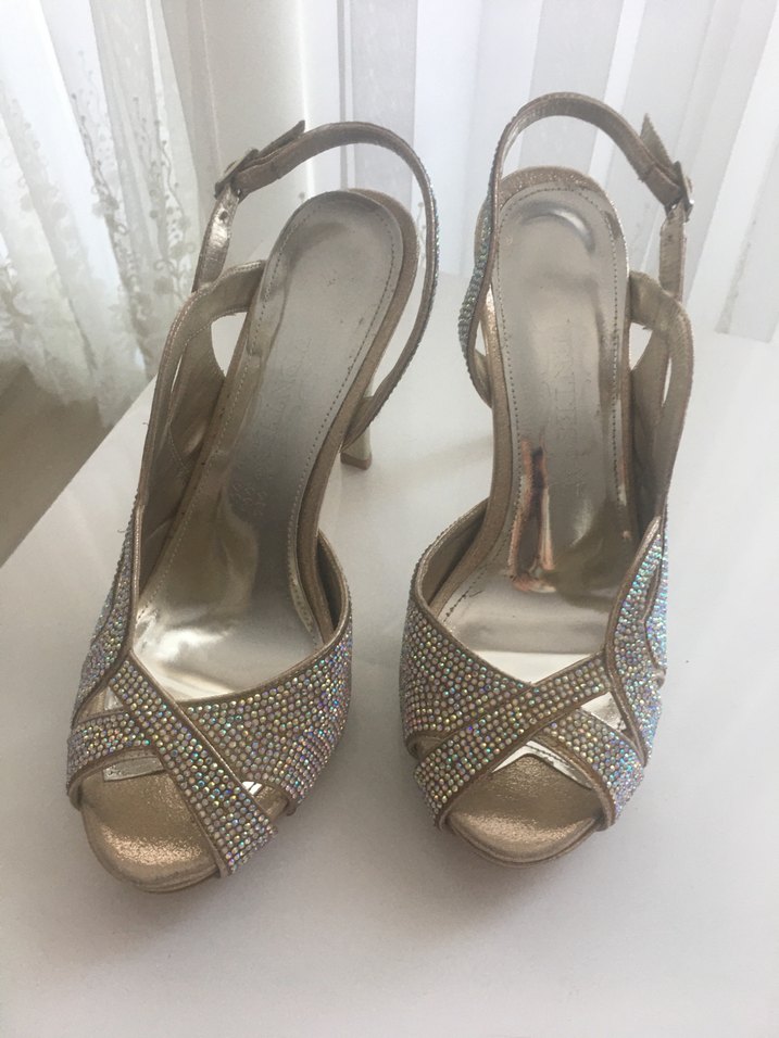 Bej renkli, parlak taş işlemeli stiletto topuklu, arkası açık ve lastik tabanlı abiye ayakkabılar.