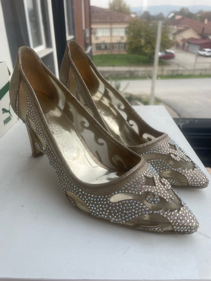 Bej renkli, parlak yılan desenli ve taşlı detaylara sahip, kauçuk malzemeden yapılmış stiletto topuklu kadın abiye ayakkabı. ✨