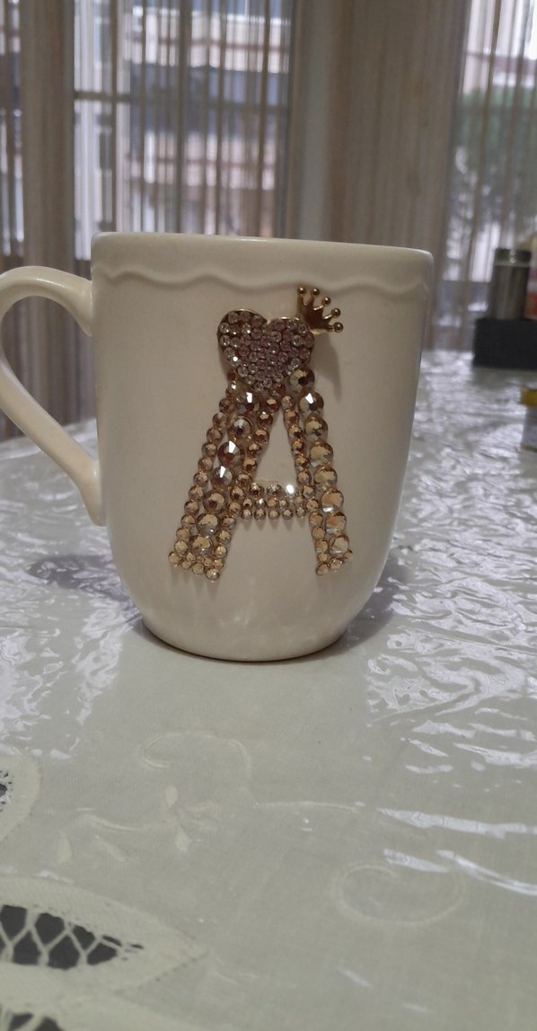 Bej renkli seramik kupa, üzerinde parlak taşlarla süslenmiş 'A' harfi ve küçük taç detayı bulunur. Kişisel dokunuş katar. ☕