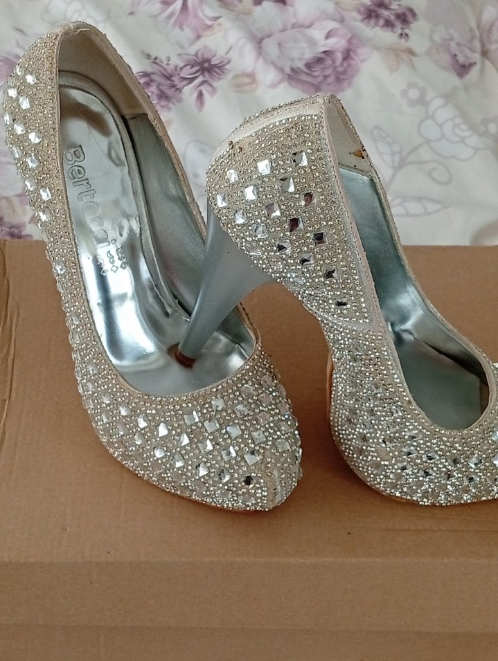 Bej renkte, parlak taşlarla süslenmiş, desenli yüksek topuklu ayakkabılar. Kauçuk tabanlı, düğün ve özel günler için uygun.