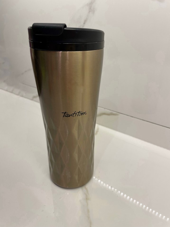 Parlak bej renkte, Tantiton markalı, siyah kapaklı termos bardak. Sıcak ve soğuk İçecek taşımak için uygundur. ☕ 2 3 kez kullanıldı sorunsuzdur.