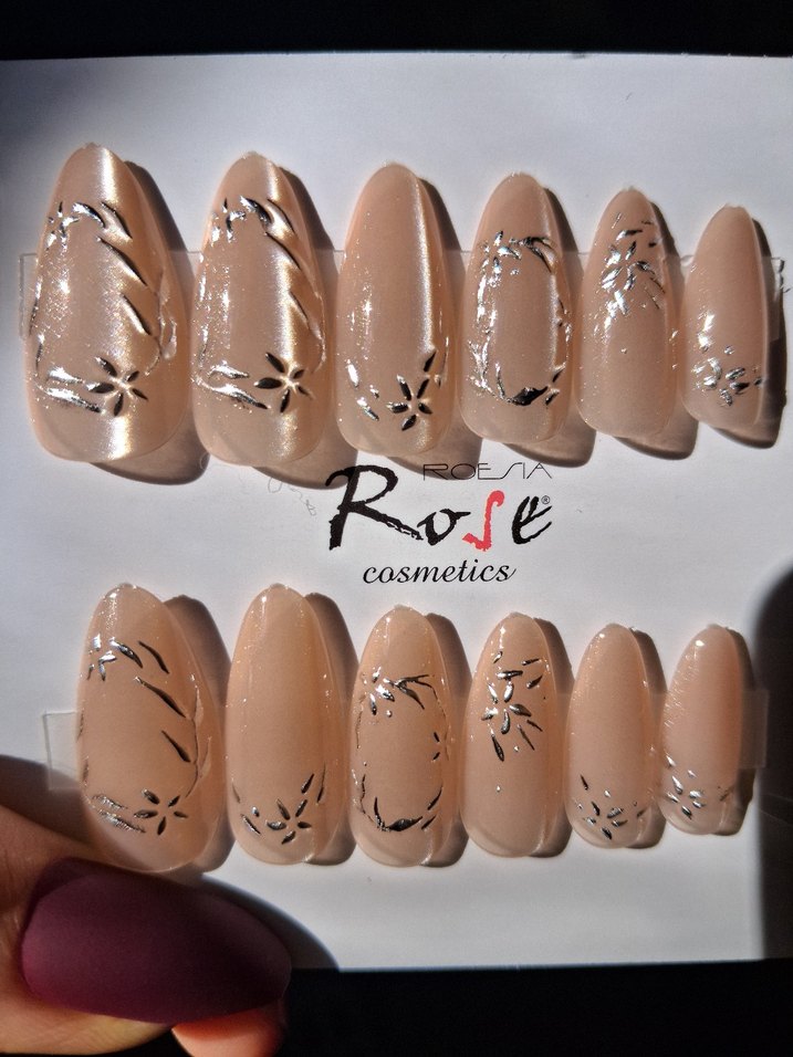 Parlak bej renkte, ince siyah çiçek desenli tırnak süsleri, zarif ve sade bir görünüm sunar. ✨