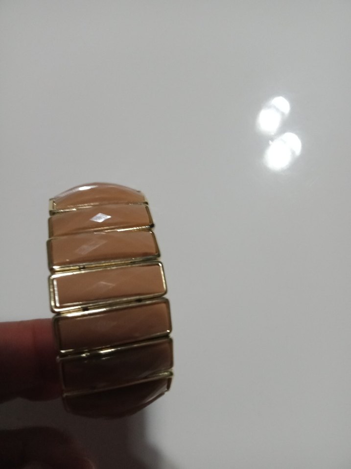 Bej renginde, parlak yüzeye sahip, tokalı kadın bileklik. Günlük kullanıma uygun, desen içermeyen çağdaş Paris tarzı.