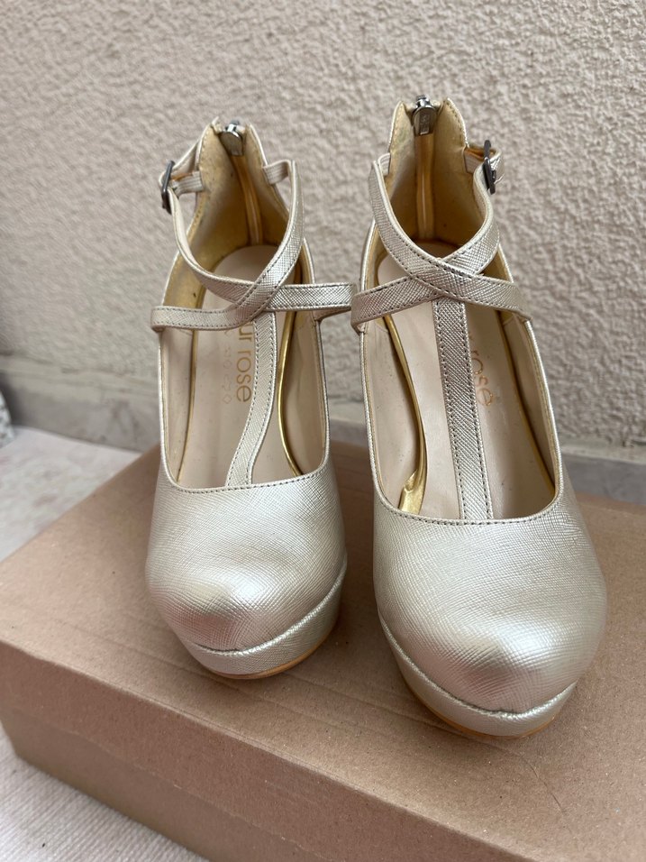 Bej renkte, parlak metal tokalı, minimalist ve modern klasik stile sahip kadın topuklu ayakkabılar, düğün için uygun. Nişan kıyafetimin altında bir defa kullandım #topukluatakkabı #inci #bambi #vakko #zara #koton