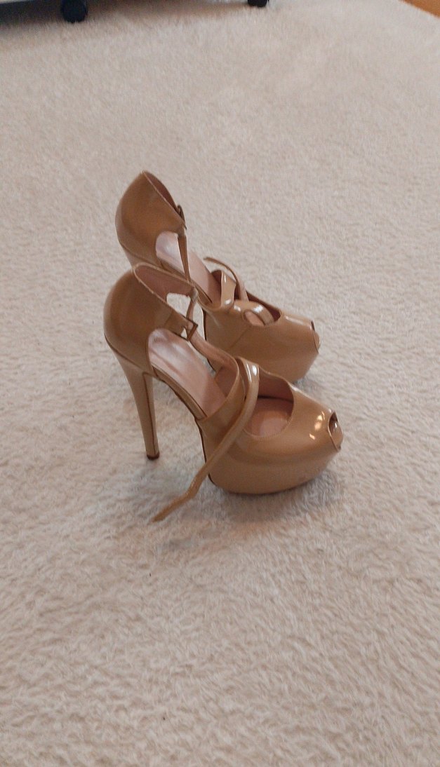 Bej parlak stiletto topuklu ayakkabılar, tokalı kayışlı ve çağdaş tasarıma sahip. Romantik akşamlar için uygun, dayanıklı kauçuk malzeme kullanılmış.
