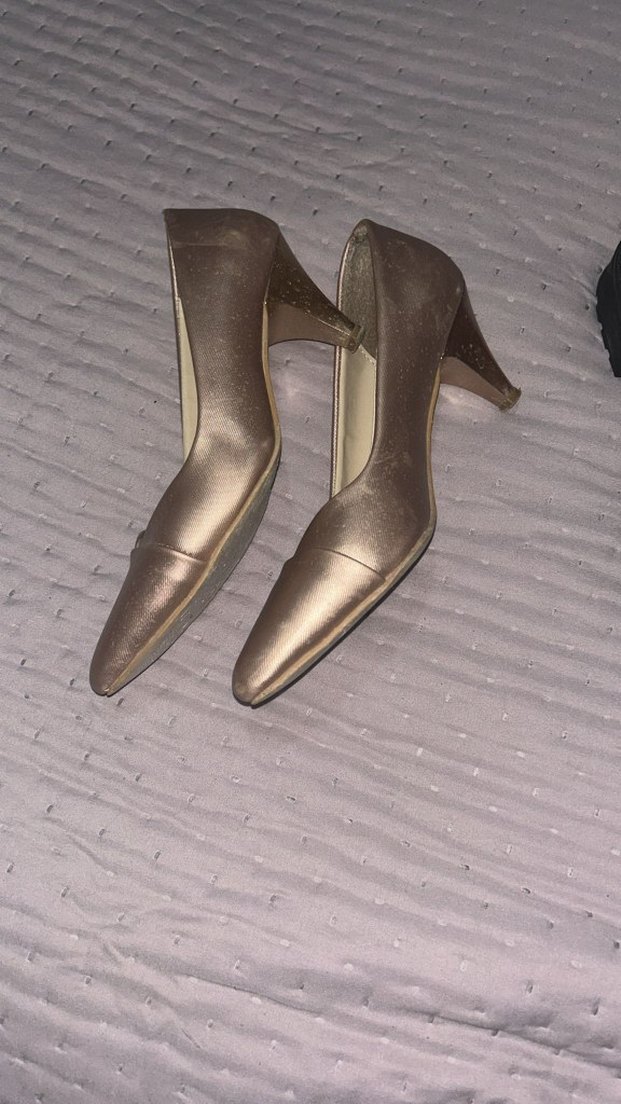 Bej parlak topuklu kadın ayakkabısı, saten dokulu ve tokalı, ofis için uygun klasik ve çağdaş tarzda.
