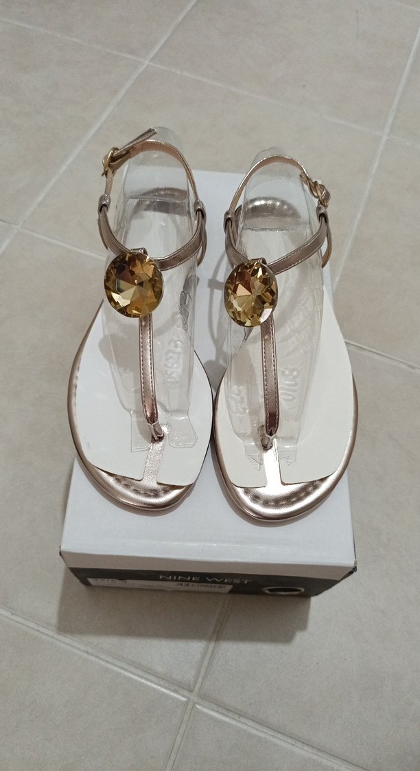 Düğmeli kayışa ve ön kısmında büyük taş süslemeye sahip, parlak bej topuksuz sandalet. Kauçuk malzemeden, çağdaş desenli, düğün için uygun.