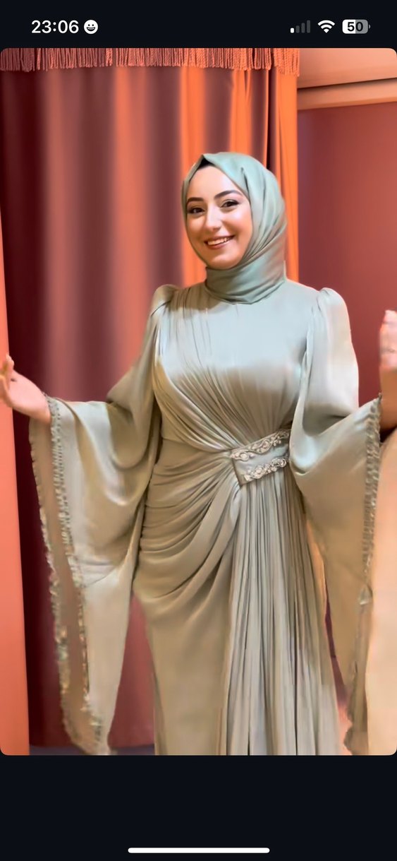 Parlak su yeşili renkli, yüksek yakalı ve uzun kollu uzun abiye. Drapeli ve bol kesim, vintage bohem tarzıyla düğünler nişan söz için uygun.
