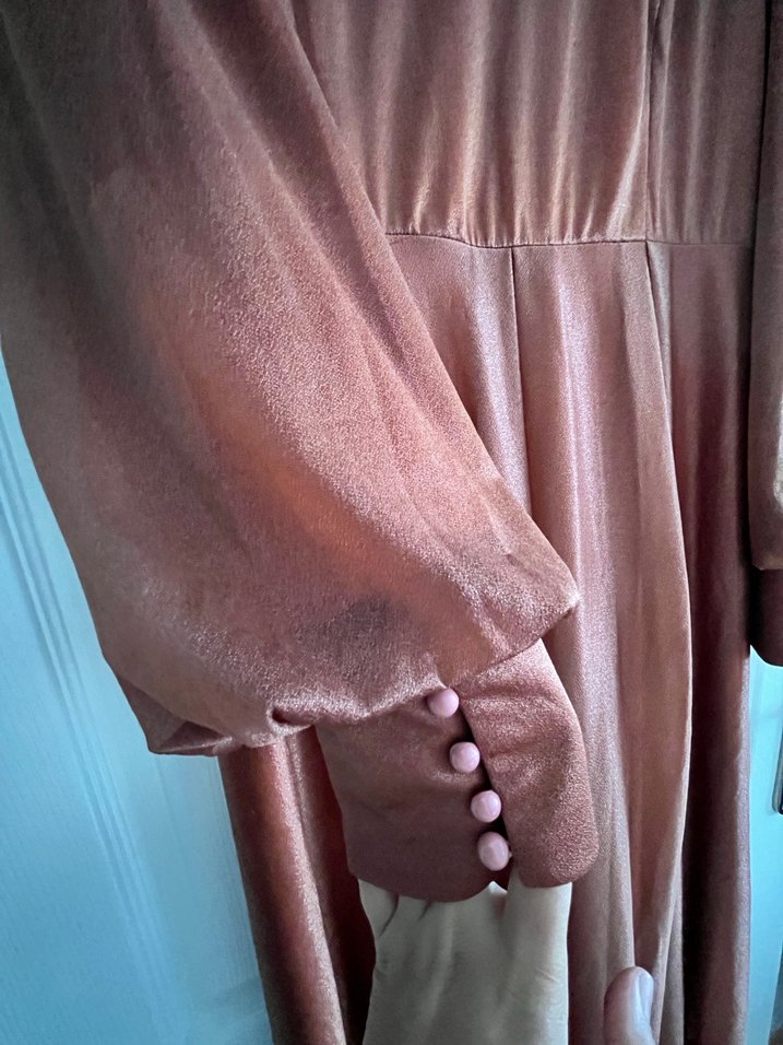 Bej renkli, parlak görünümlü, uzun kollu ve düğmeli manşetli ipeksi kumaştan yapılmış, V yakalı ve bol kesimli bohem vintage tarzı uzun elbise. Düğünler için uygun. ✨