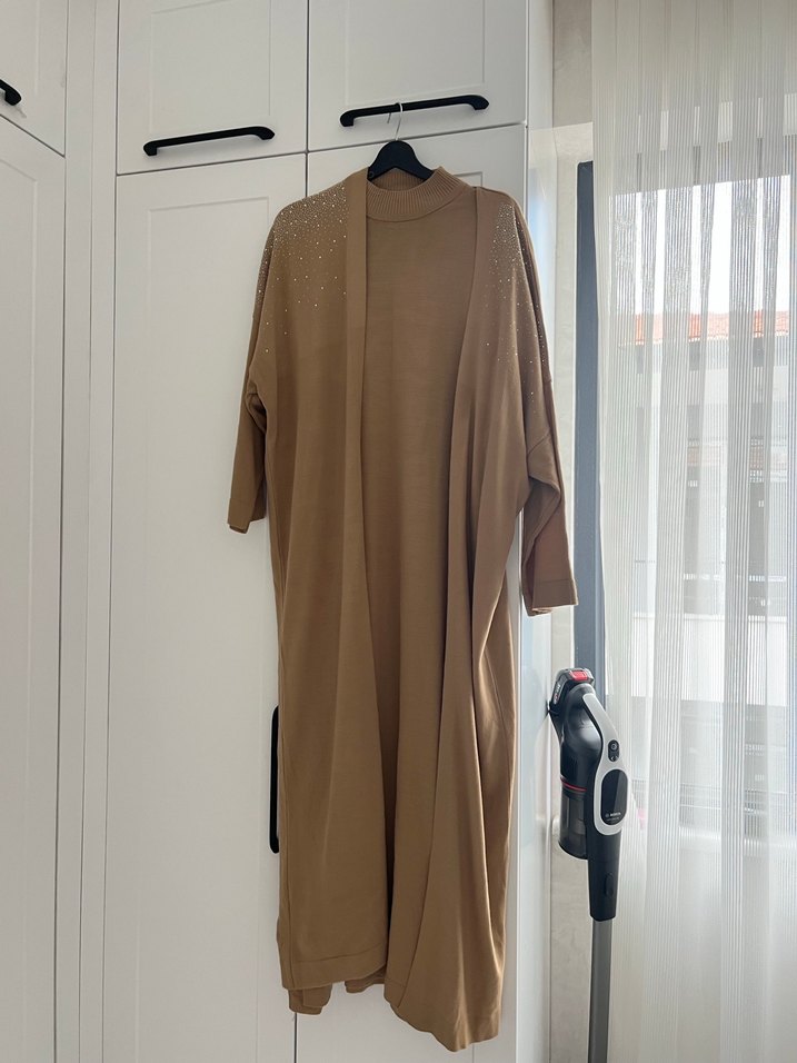 Bej renkli, uzun ve bol kesim kadın sabahlığıdır. Uzun kollu, parlak ve desensiz yapısıyla rahat normcore tarzını yansıtır. ️