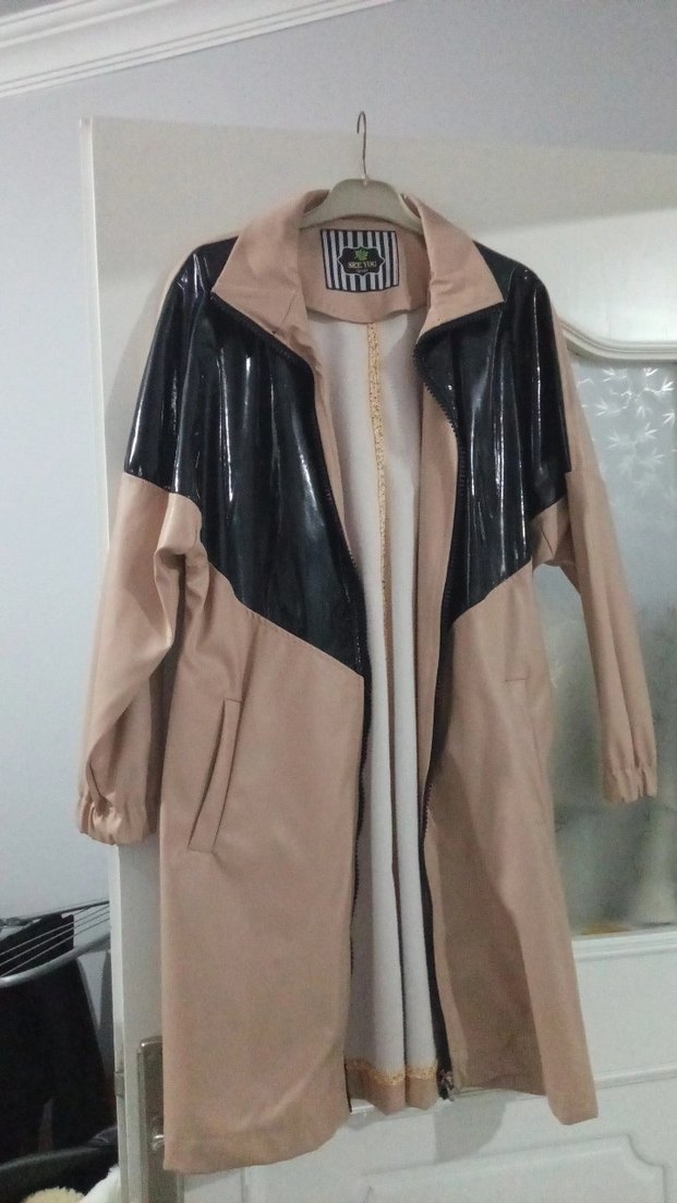 Bej sentetik kumaştan, parlak siyah detaylı uzun kesim, regular fit kadın yağmurluk. Uzun kollu ve açık yaka, günlük sokak tarzı için uygun. ☔