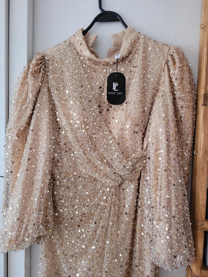 Bej Parlak Uzun Kollu Drapeli Abiye Elbise