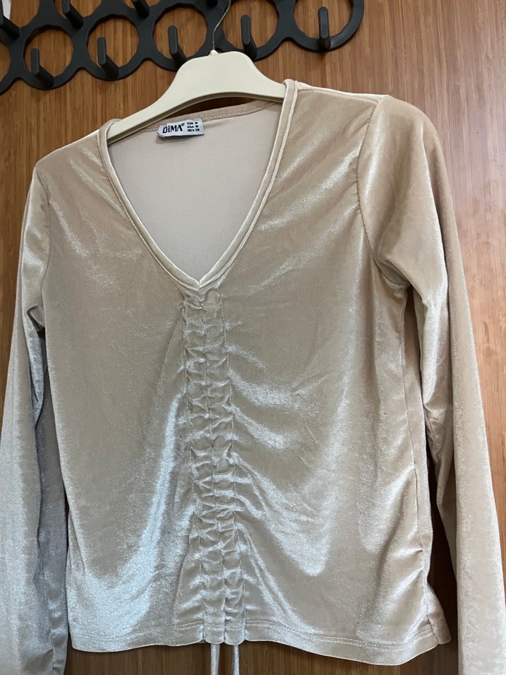 V yaka, uzun kollu, büzgülü detaylı, parlak bej renkli bluz. Günlük kullanıma uygundur.