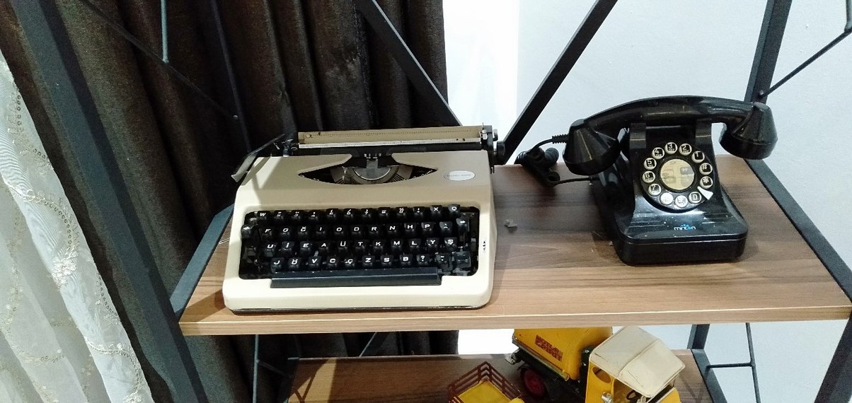 Bej renkli vintage daktilo, parlak yüzeyi ve klasik siyah tuşlarıyla nostaljik bir yazma deneyimi sunar. ️