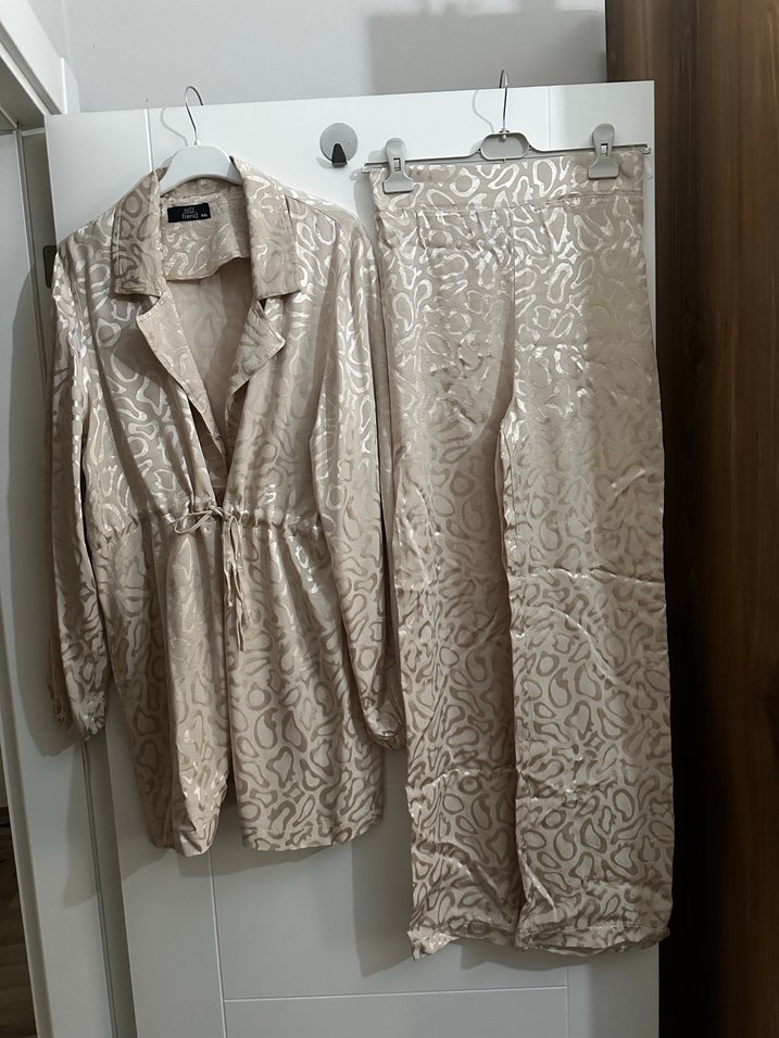 Bej parlak yılan desenli kadın takımı, uzun kesim ceket ve eşofman tarzı pantolondan oluşur. İpek gibi kumaşı, hiç giyilmedi